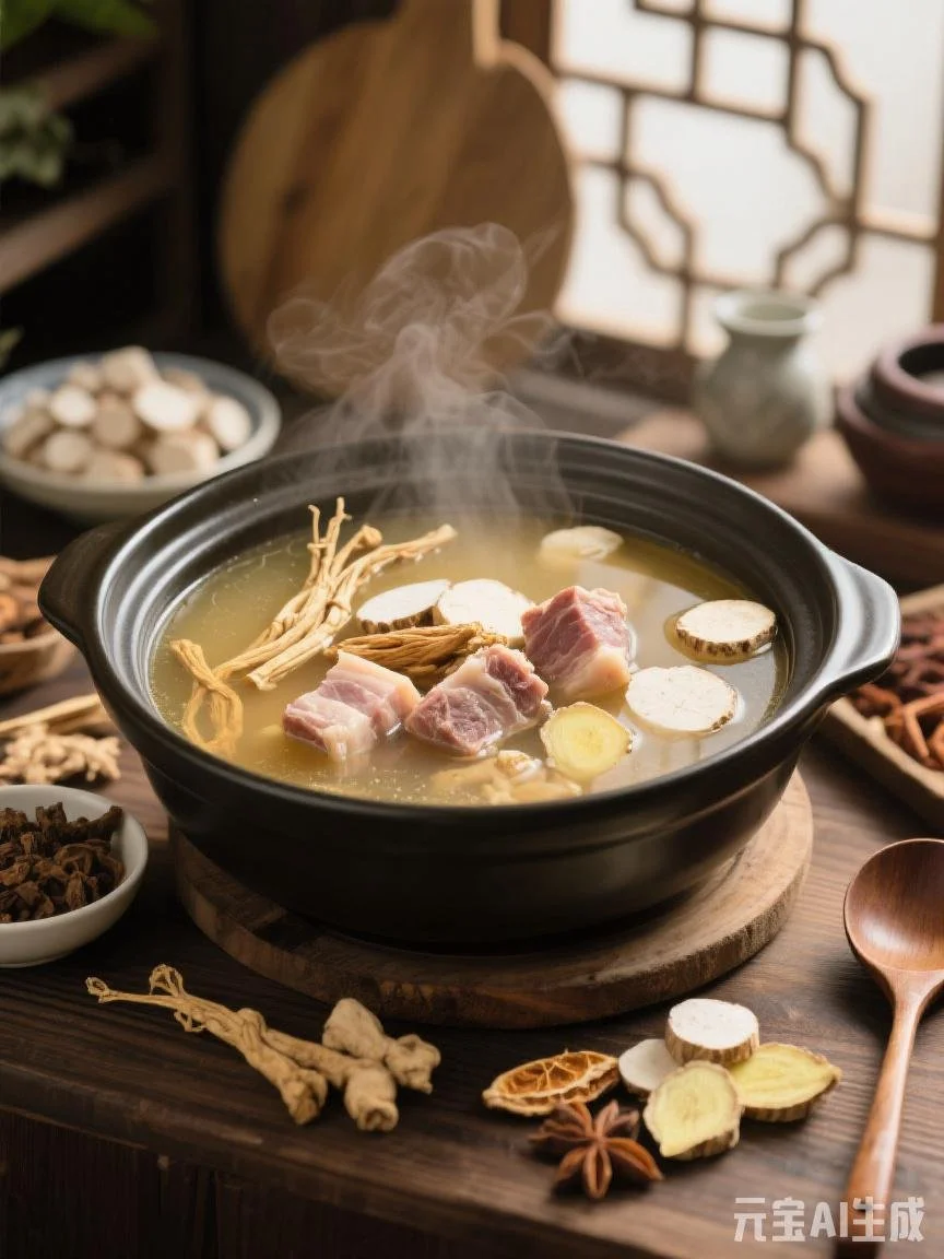 Ingredients: Codonopsis 15g (replaces ginseng), Atractylodes 10g, Poria 20g, Citrus peel 5g, Chinese yam 30g, Ginger 5 slices, Lean pork 200g